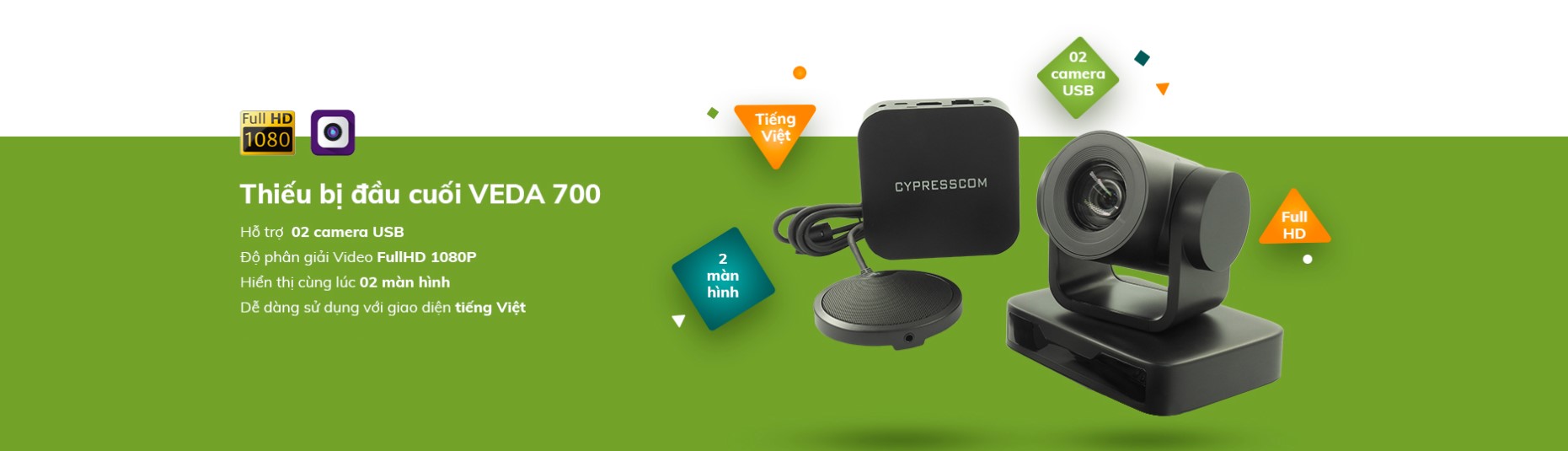 Hình ảnh Full HD thế hệ mới Cypresscom VEDA 700 cung cấp giải pháp trực tuyến hỗ trợ nhiều loại camera với giao thức USB và độ phân giải tối đa lên tới Full HD 1080P. Số khung hình trên giây đảm bảo ở mức 25fps (đối với chuẩn EU 50Hz) và 30fps (đối với chuẩn USA 60Hz) đảm bảo chuyển động của video luôn mềm mại và trung thực. Hiển thị đa màn hình với 2 đầu ra độc lập HDMI và VGA phù hợp với mọi phòng họp ở Việt Nam. |